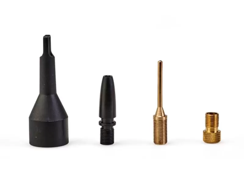 Supplied with a 3 piece adaptor set (ball needle, a tyre adaptor and a conical adaptor). The adaptors are accommodated in the practical, integrated storage compartment in the compressor housing.