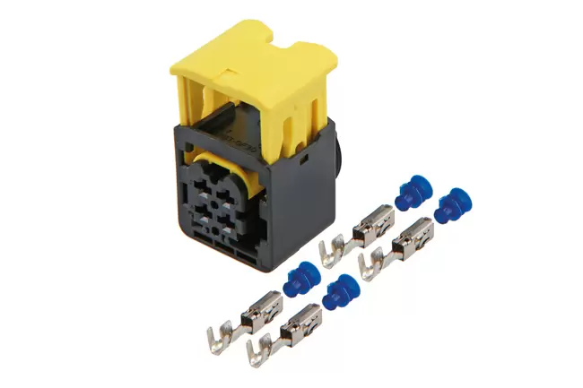 - Contains: 1x 4-pin connector housing, 4x 2.8 terminals & 4x weather seals (blue).