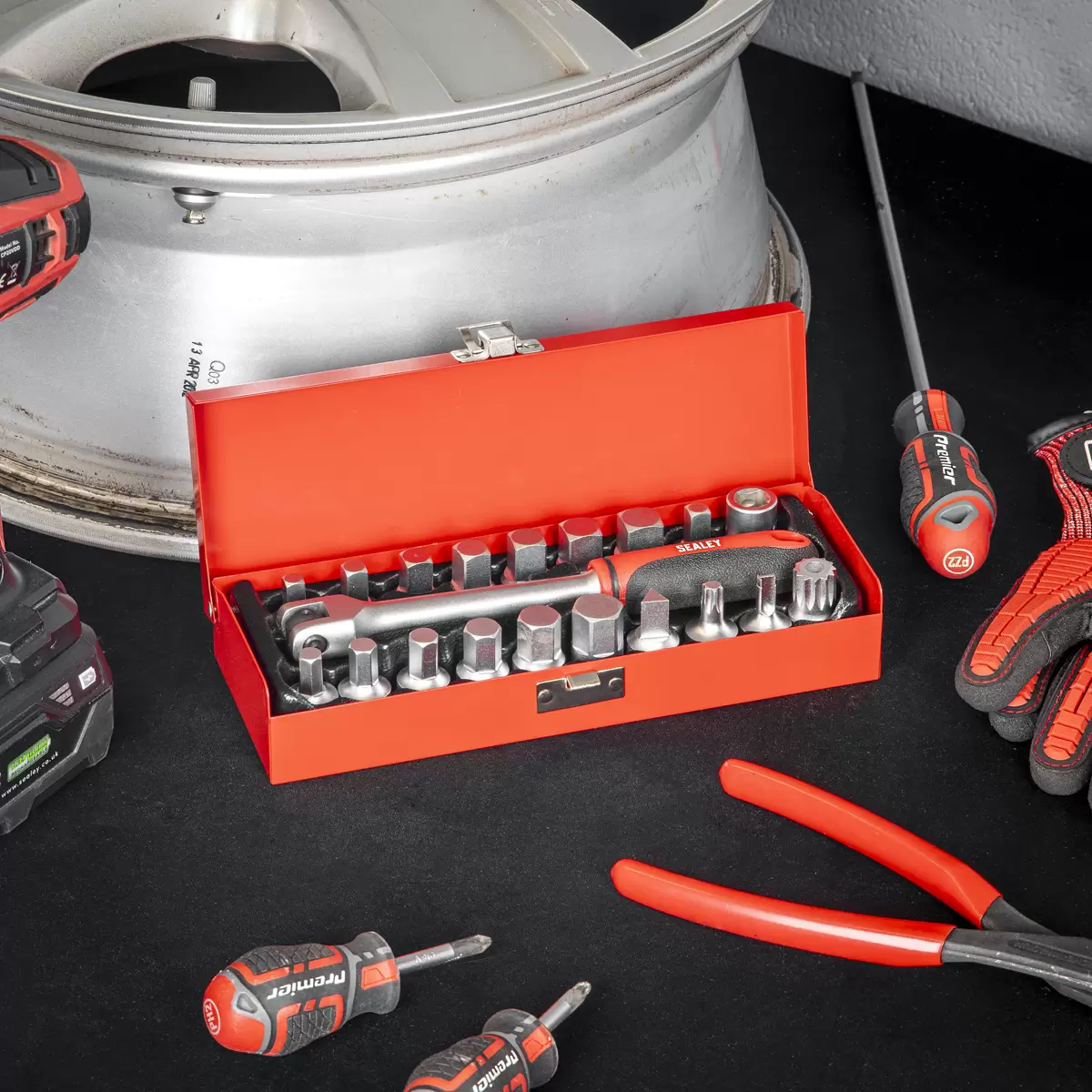Contents: Contents: Hex Sockets; 8, 9, 10, 12, 14, 17mm, Square Sockets 5/16"; 7, 8, 10 Male (x1), 10 Female (x1), 11,12, 13, 14mm, Triangular Socket 10mm, Security Spline M16, VAG Plug Bit, VAG T45 TRX-Star* Socket, Flexible Handle 200mm