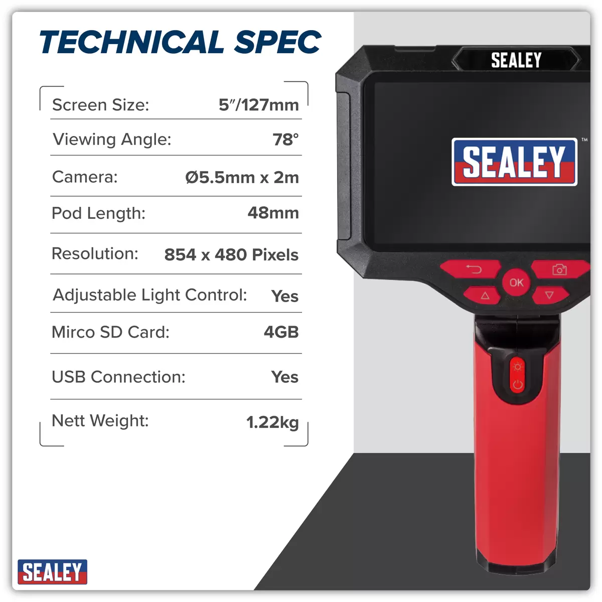 Sealey - VS8118 - Video Borescope 5.5mm Camera Dual Lens & 5" Screen