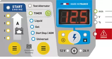 • 100% recharging of batteries with a capacity of 20 to 750 Ah at 12 V and 20 to 525 Ah at 24 V. • Starting power of 500 A at 12 V and 400 A at 24 V. • Front panel digital display for fast, accurate voltage readings. • On-board electronics protection. • Space for cables and clamps. • Integrated wheels and handle for easy transport.