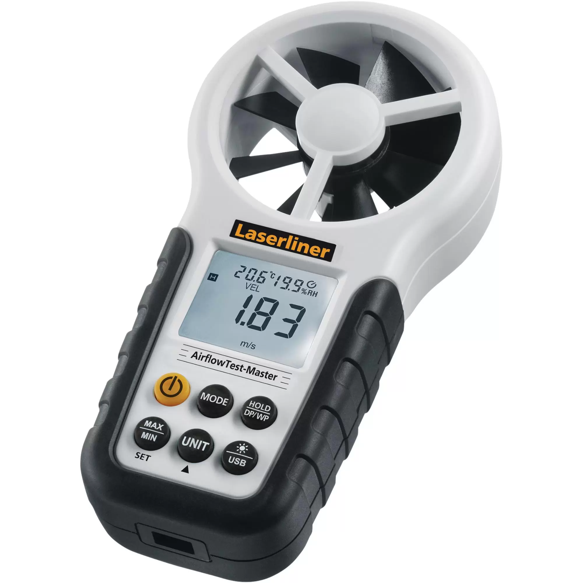 This professional anemometer provides precise measurement of air flow, volumetric flow and wind speed. The integrated sensors constantly register the ambient temperature and relative humidity, and calculate the dew point temperature. The hold function allows the current measured value to be retained on the display. The device features a USB interface and PC software for real-time logging. The 1/4” tripod connection allows the device to be easily set up in the test area, ideal for long-term measurements. The clearly laid out, illuminated display is easy to use. Supplied with USB cable, battery and carrying case.