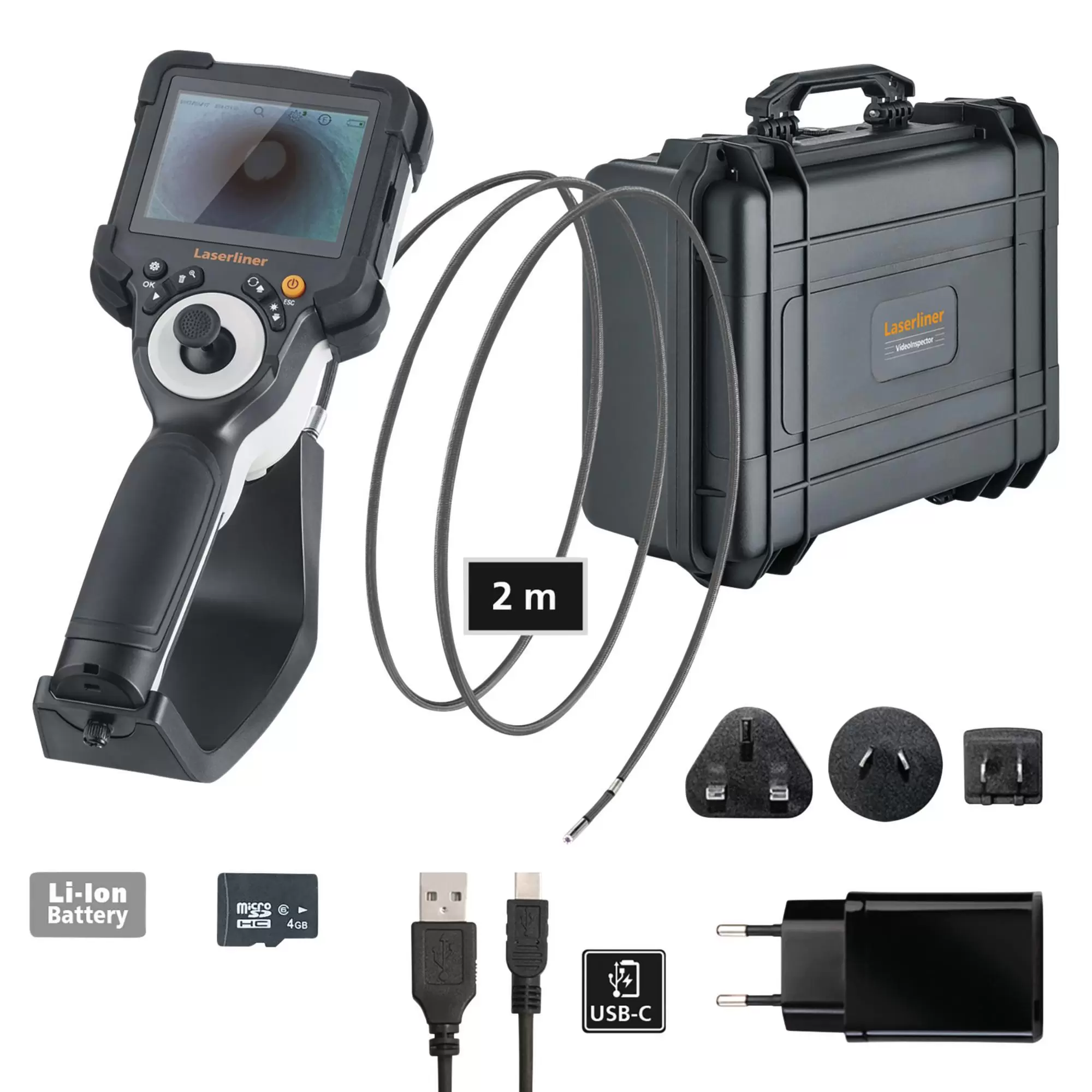 This professional video inspection system offers maximum flexibility, even on tricky jobs. It has an individually flexible and extremely small camera head which is perfect for narrow openings. The camera head can be quickly adjusted to the optimum view using the joystick on the base unit. This allows hard-to-reach places to be investigated which cannot be viewed with fixed camera systems. However, it provides very reliable, 360° inspection of, for example, pipe seals and the damage can be precisely located. The camera head and probe are waterproof and resistant to diesel, petrol, motor oil, AdBlue®, ethanol and sea water, making the device extremely versatile. Further benefits include the top quality LED object lighting and the magnetic stand for setting up the base unit. upplied with battery, network/charging device, incl. international adapter, USB cable, micro-SD card and carrying case.