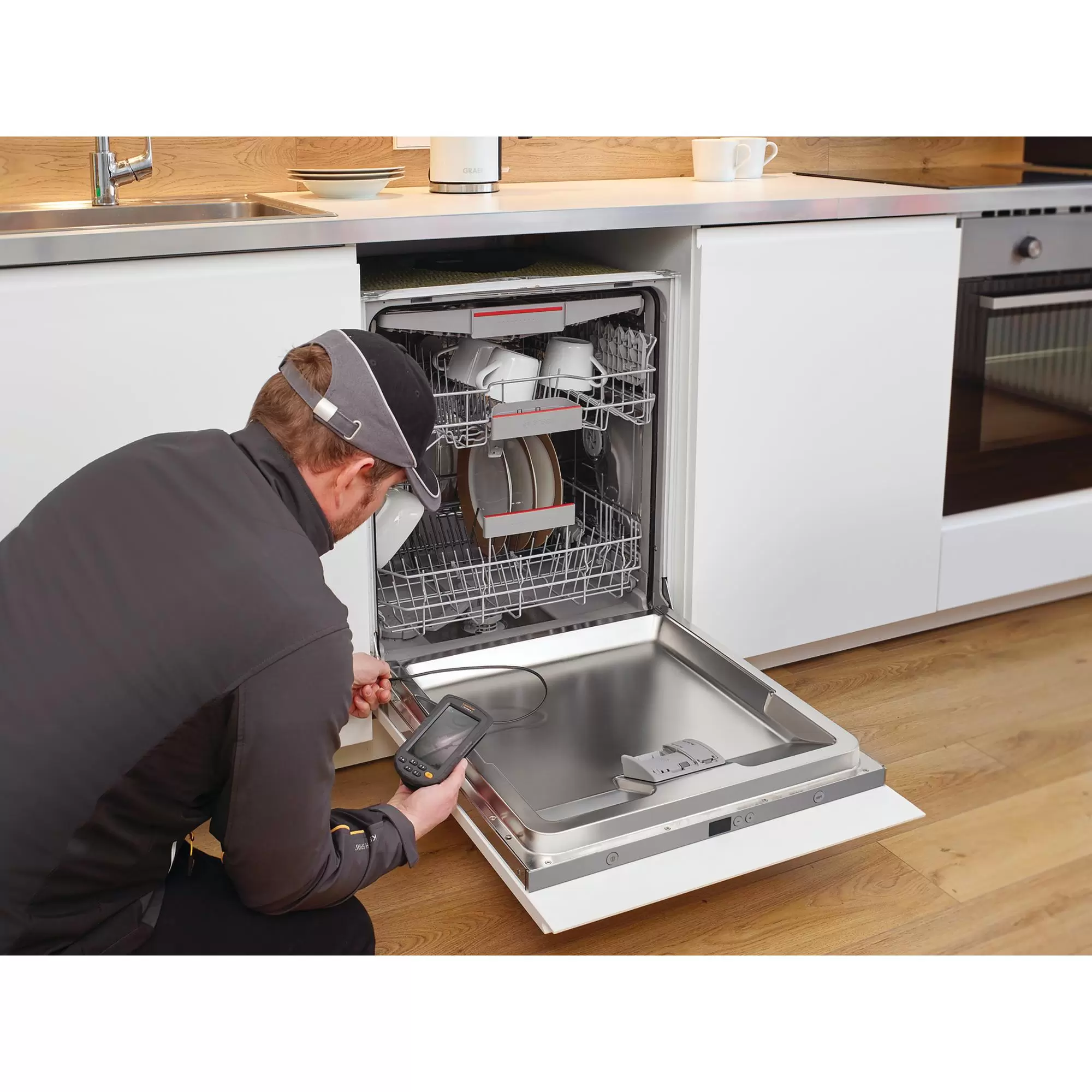 Effective problem localisation behind or in objects, walls, pipes, cavitiesHigh-resolution camera for detailed image and video captureIdentify specific differences with the compare image functionSmall camera unit ideal for hard-to-reach placesPowerful object lighting thanks to six high-performance LEDsLarge, exceptionally easy-to-read displaySuitable image available on the monitor through rotation and mirroringWaterproof and dustproof camera unitMagnet, mirror and hook mount for fixing on the camera headSupplied with TopClips, micro-SD card, batteries and a carrying case.