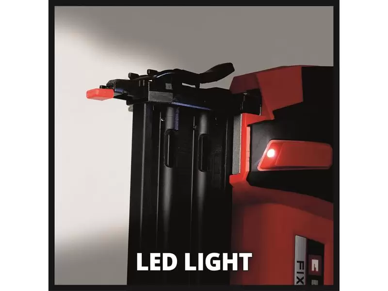 Nails jammed in the firing channel can be removed without tools. The slim design with rubberised side surfaces and ergonomic softgrip ensure comfortable handling. Integrated LED lighting on both sides of the housing ensures optimum illumination of the working area. The safety nose prevents accidental triggering of the nail gun and thus protects against injury.