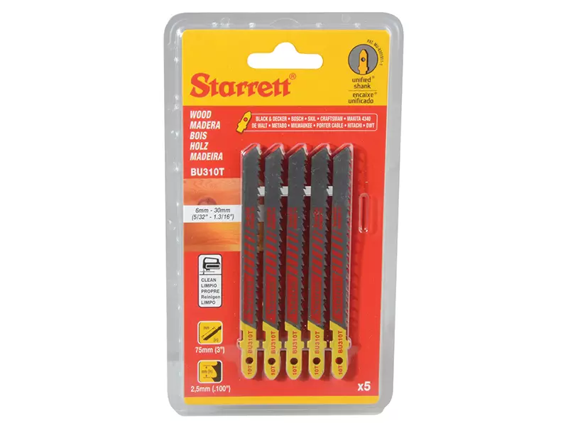 The Starrett BU310-5 Wood Cutting Jigsaw Blades with Unified Shank™, will fit in virtually all jigsaw machines. These blades feature 170% more weld contact area than standard bi metal blades through the Unique™ solid state diffusion bonding process. This ensures exceptionally strong teeth, combined with the multiple cutting edges and split chip advantage, ensure that these blades typically last 25% longer than directly competing products.