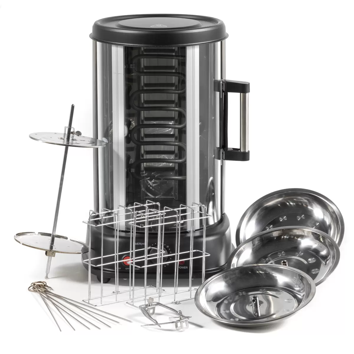 Accessories: 1 x Rotisserie Spit Set, 1 x Drip Tray, 2 x Fish Baskets, 2 x Bake Pans, 1 x Kebab Set with 7 Skewers