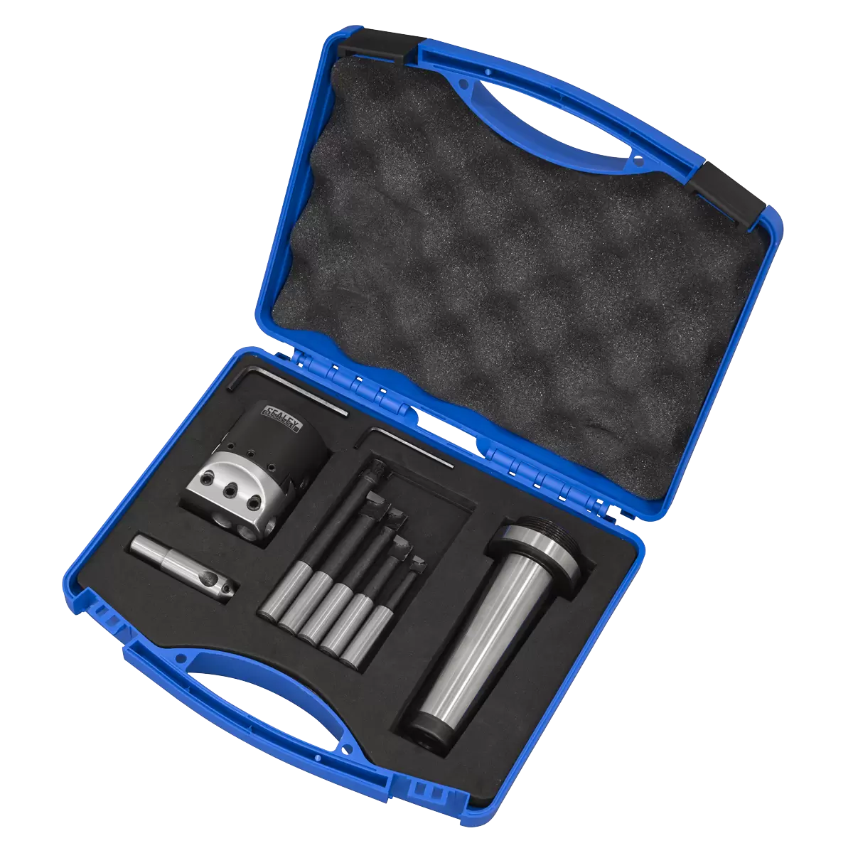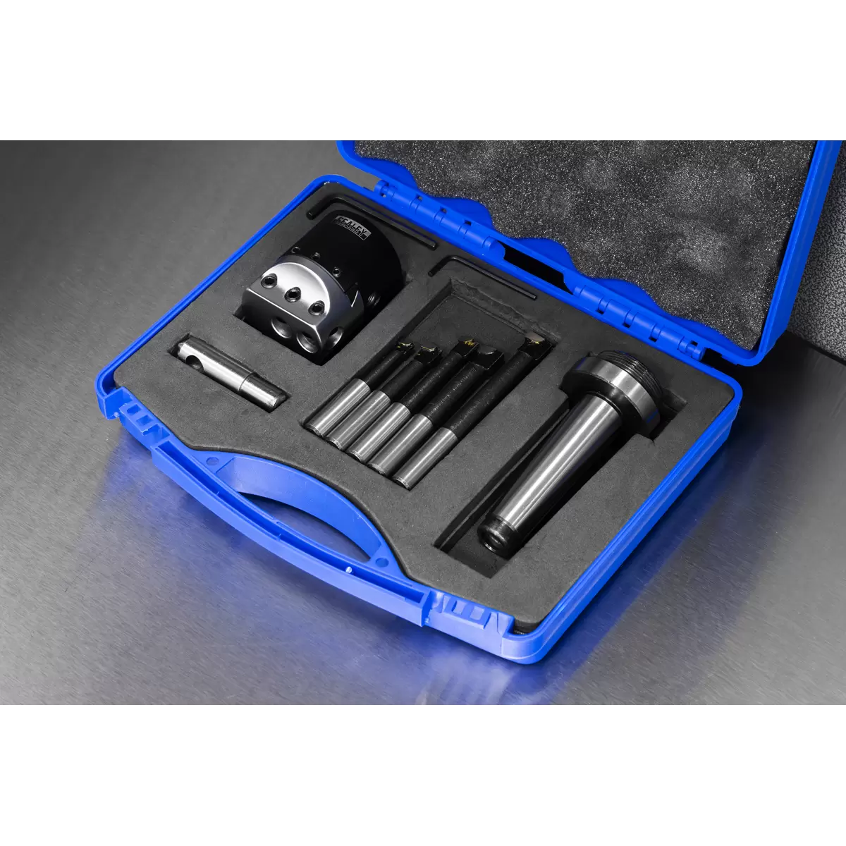 Contents: Boring Head, Boring Bars Ø12mm (x5), MT3 Shank, 45° Fly Cutter for 8mm Round Tools, Hex Keys (x2).