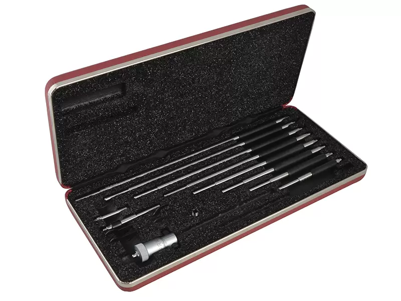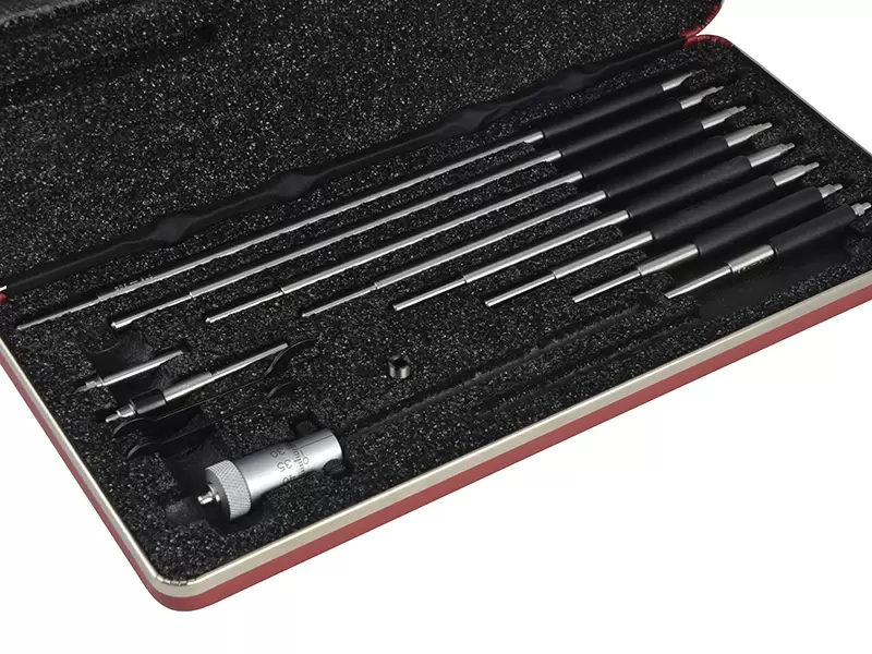 Lightweight and ideal for measuring inside diameters, the rods are solid, insulated and assembled on one side of the micrometer head. Anvils on rods are adjustable for length. Rod and anvils are hardened and ground.