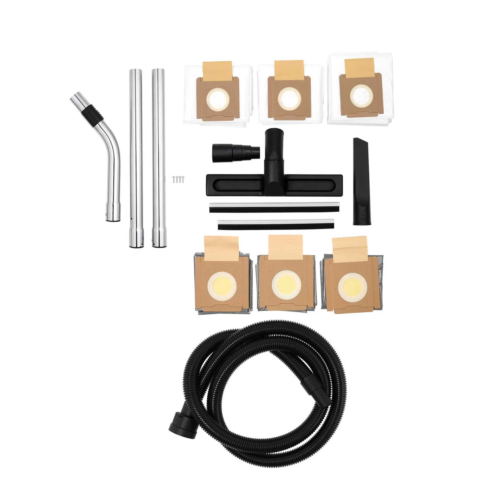 This wet and dry vacuum cleaner is designed to meet with the M-class standard and effectively removes 99.9% of medium hazardous dust removal, in accordance with HSE recommendations. It features a 110V power take-off socket (max. 660W) for automatic dust extraction during sanding and drilling. The 1100W motor provides 210W of air watts for strong suction performance. To maintain optimal suction, the vacuum includes a filter cleaning system that prevents clogs and removes trapped debris, extending the lifespan of the vacuum. The anti-static hose is designed to prevent the build-up of static electricity and blockages caused by ultra-fine particles. An LED indicator alerts when airflow drops below 20m/s. The adjustable motor speed allows for enhanced suction control, which can be lowered for delicate surfaces or increased for more challenging tasks. The sealing cap effectively blocks hazardous dust from entering or escaping when the vacuum is turned off or being moved. A wide range of accessories is included.