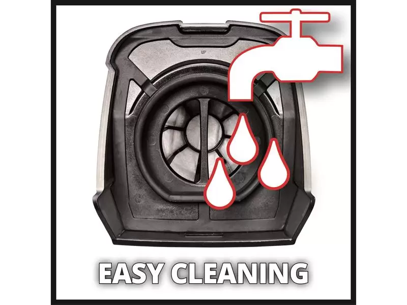 The dust collector has a capacity of 600 millilitres and can be easily emptied at the touch of a button. The integrated wall bracket ensures space-saving storage. Thanks to its ergonomic design and softgrip surfaces, the 1kg lightweight hand-held vacuum cleaner lies comfortably and easily in the hand. The integrated dirt filter can be cleaned and reused under running water after it has dried completely.