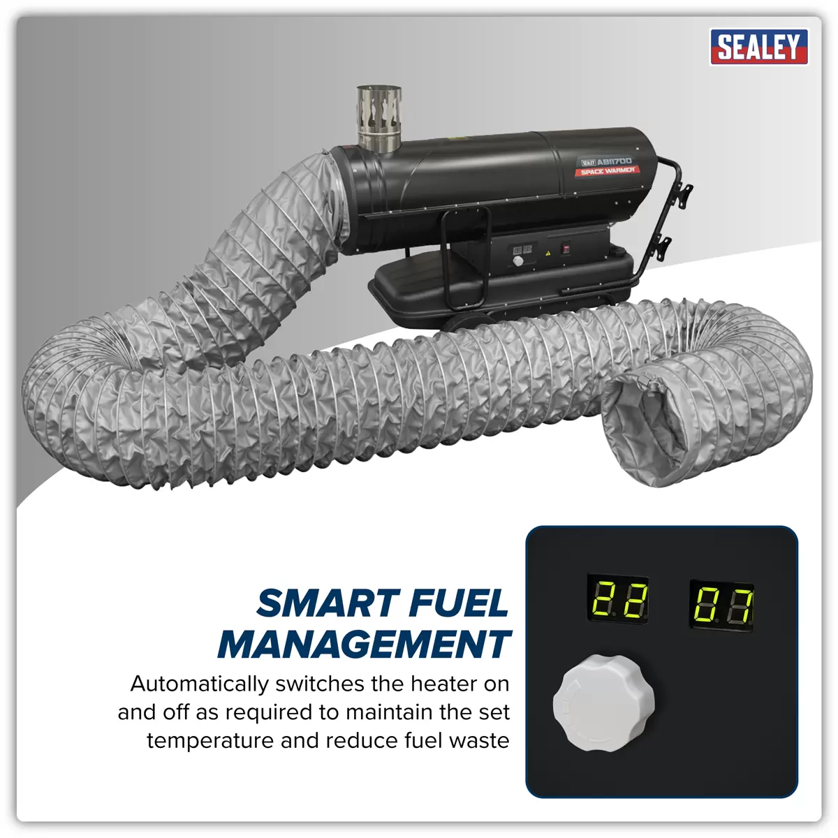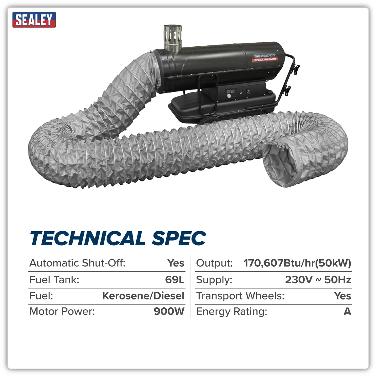 Home > Hardware / Consumables > Environmental & Janitorial > Sealey - ABI1700COMBO - Space Warmer® Indirect Kerosene/Diesel Heater 170,000Btu/hr with 5M Ducting