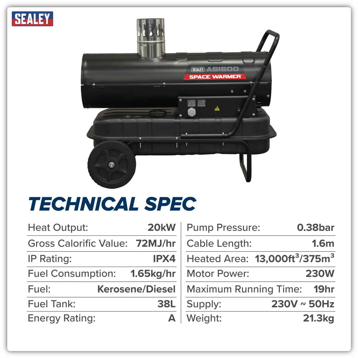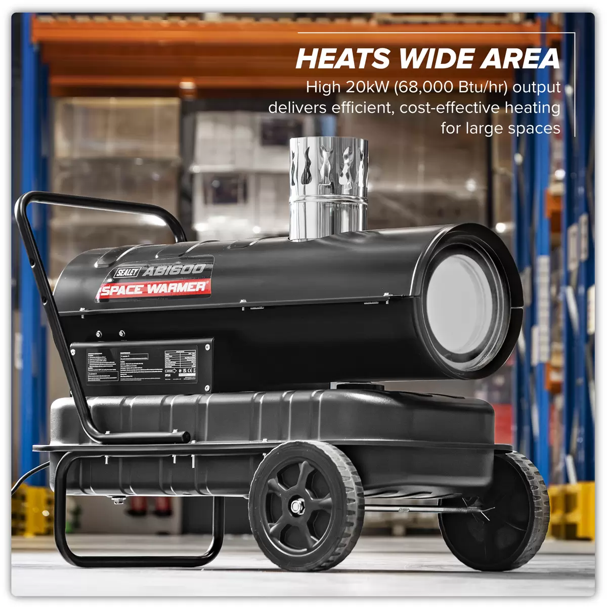 Home > Hardware / Consumables > Environmental & Janitorial > Sealey - ABI600 - Space Warmer® Indirect Kerosene/Diesel Heater with Wheels 68,000Btu/hr