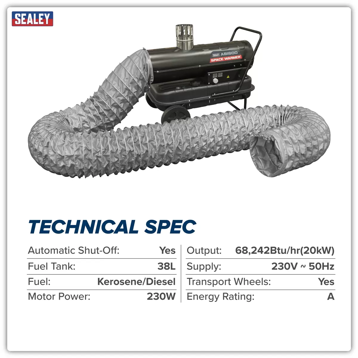 Home > Hardware / Consumables > Environmental & Janitorial > Sealey - ABI600COMBO - Space Warmer® Indirect Kerosene/Diesel Heater 68,000Btu/hr with 5M Ducting