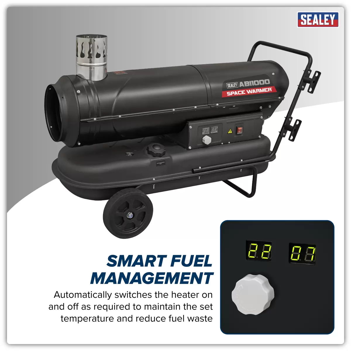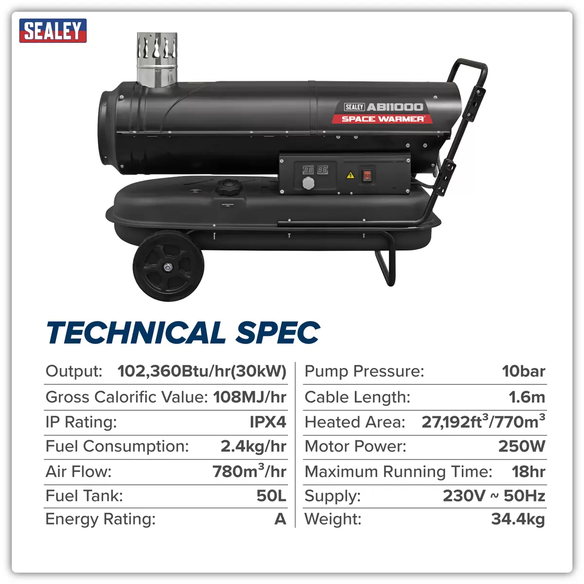 Home > Workshop Equipment > Heating, Ventilation, and Air Conditioning > Sealey - ABI1000 - Space Warmer® Indirect Kerosene/Diesel Heater with Wheels 102,000Btu/hr