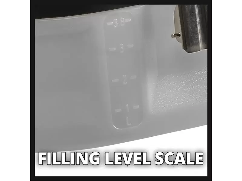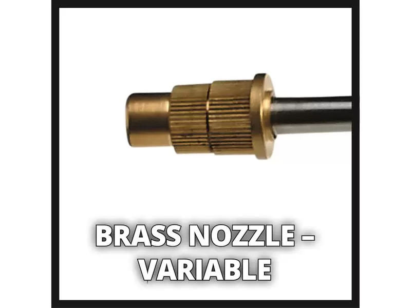 A scale in the transparent tank gives an indication of the fill level of the 3.5 litre tank at a glance. Large metal handles on the tank have been designed to make opening and closing easier. The telescopic spray lance is made of stainless steel and fitted with a lockable control button. There is also an individually adjustable brass nozzle.