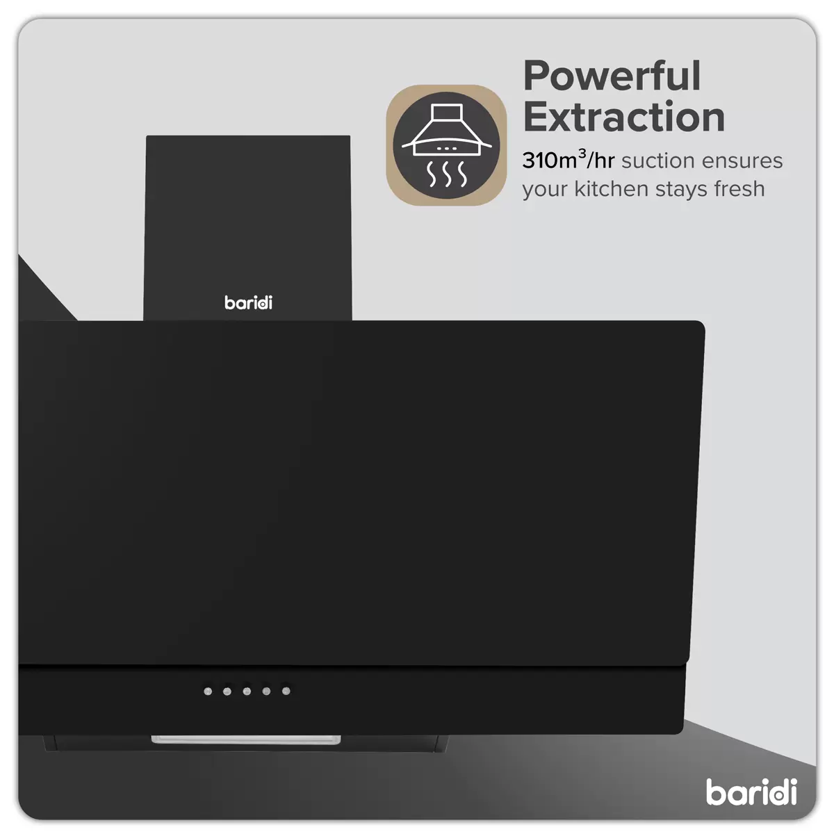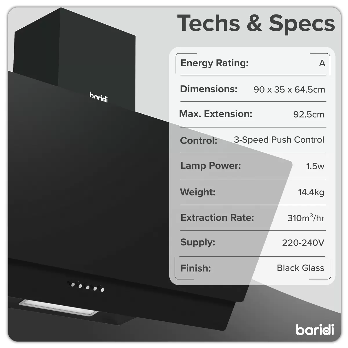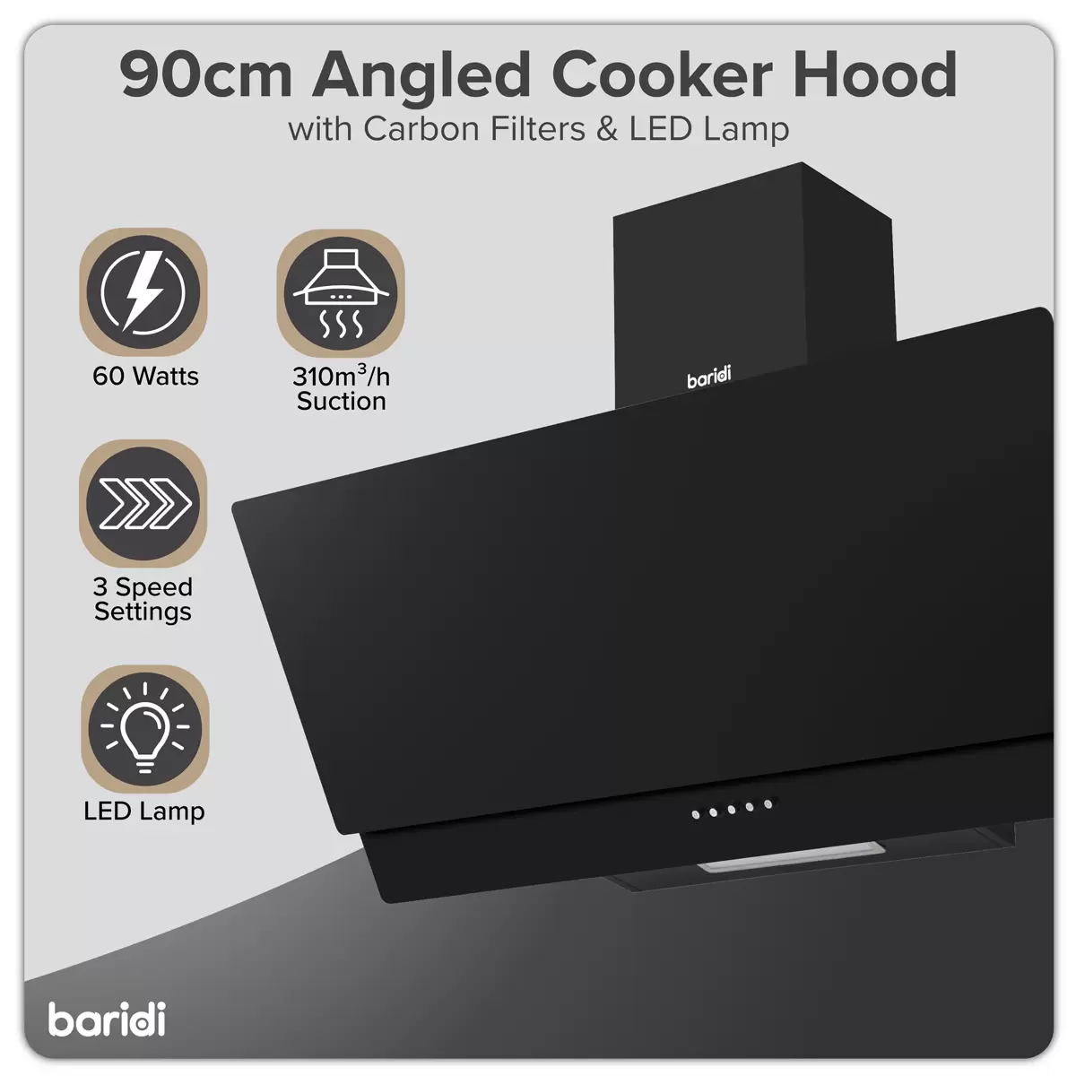 Baridi - DH106 - Baridi Angled Chimney Cooker Hood with Carbon Filters & LED Lamp 90cm, Energy Class A - Black Glass