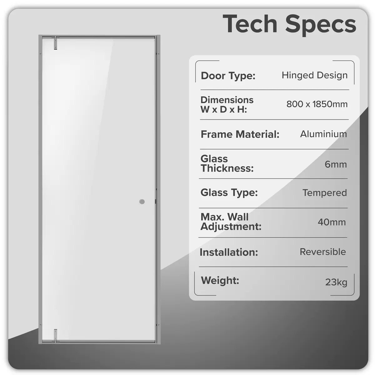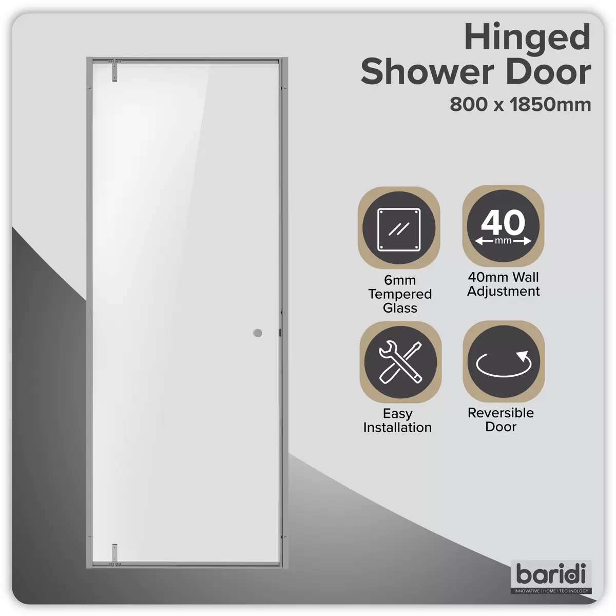 Home > Hardware / Consumables > Home & Leisure > Dellonda - DH306 - Hinged Shower Door 800 x 1850mm, 6mm Tempered Glass, Reversible - Chrome