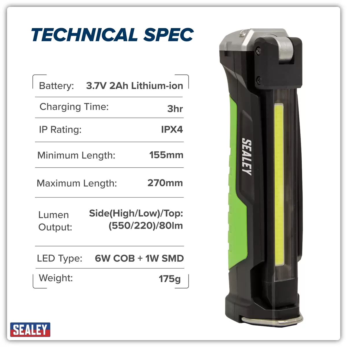 Sealey - LED186 - Rechargeable Slim Folding Inspection Light 6W COB LED & 1W SMD LED Lithium-ion