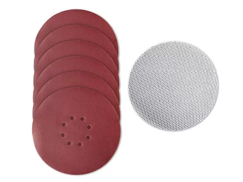 The 6 pieces of sandpaper (Ø 225 mm) with different grain sizes (2x P60, P80, P120 each) and a mesh lines can be easily and quickly attached to the sanding wheel using hook and loop fastening. No Battery or Charger supplied.