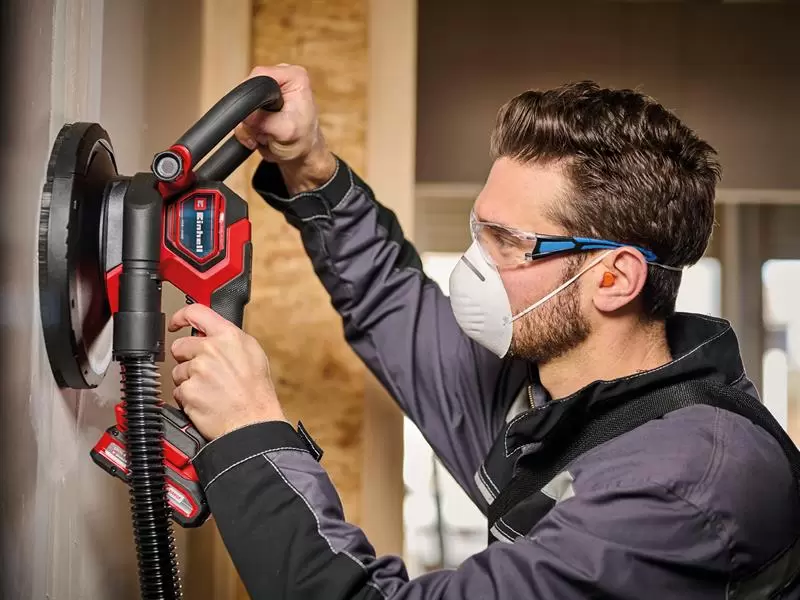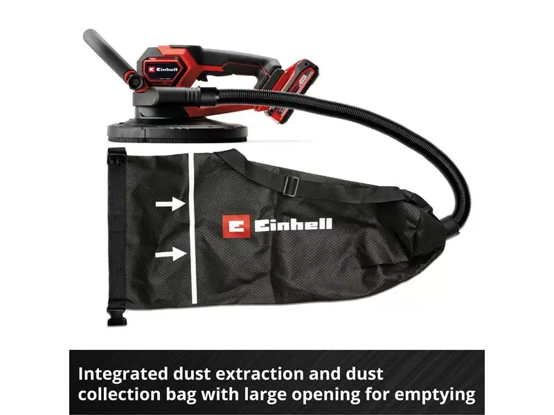 In combination with its low weight of 2.4 kg and the two handles equipped with softgrip, main handle and auxiliary handle, the Einhell cordless drywall sander fits well in the hand and enables safe and comfortable work. The integrated dust extraction ensures a clean working area and is attached to the supplied dust collection sack with carrying strap with the help of the Ø 35mm suction adapter and a 4.5m long suction hose. The brush ring can be removed from the spring-loaded sanding plate, ensuring optimum contact with the wall or ceiling.