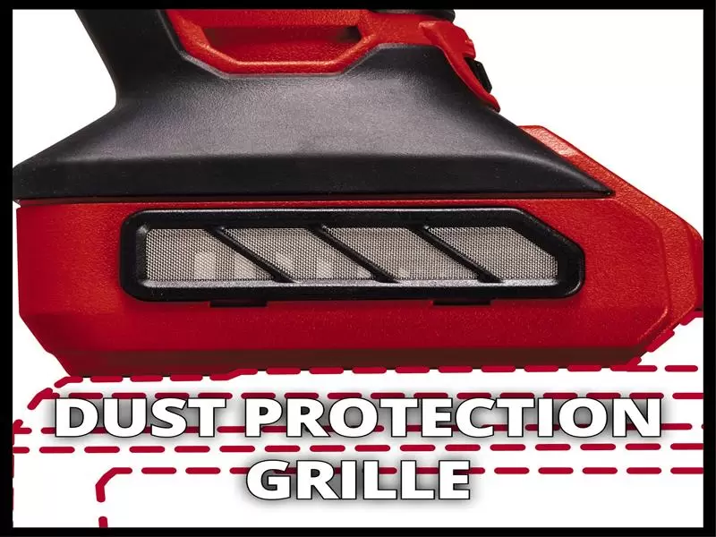 An integrated dust screen protects the interior of the device from dirt and, in combination with the intelligent air ducting, increases the service life. For cleaning, the grille can be easily removed. An overload protection prevents overheating damage and soft start and restart protection ensure high safety during work.
