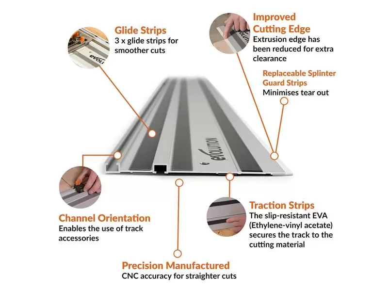 There is also a third glide strip on the top for less drag and a sacrificial edge strip. Made from a more compliant, longer lasting foam that makes aligning your cut easier than ever. Underneath we’ve chosen a new high-grip rubber for the traction strips, making your track more stable even when used without the improved Quick Release Track Clamps.