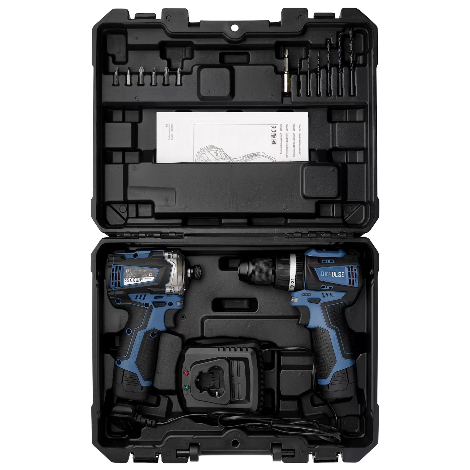 This cordless combi drill and impact driver kit is part of the DXPULSE 12V Interchange Series. The brushless motor enhances efficiency, offering more power and a longer battery life. See individual spec for full details of features - combi drill (Stock No. 27761) and impact driver (Stock No. 27876).The compact design makes them ideal for use in tight spaces. Weighing less than 1 kg, they are easy to use, and the soft grip handle ensures comfort during extended use. It is powered by a 12V lithium-ion battery, and there is an LED battery level indicator. Comes complete with 2 x 2.0Ah batteries and 1 x charger, a range of screwdriver bits, bit holder and HSS drill bits in a sturdy plastic storage case