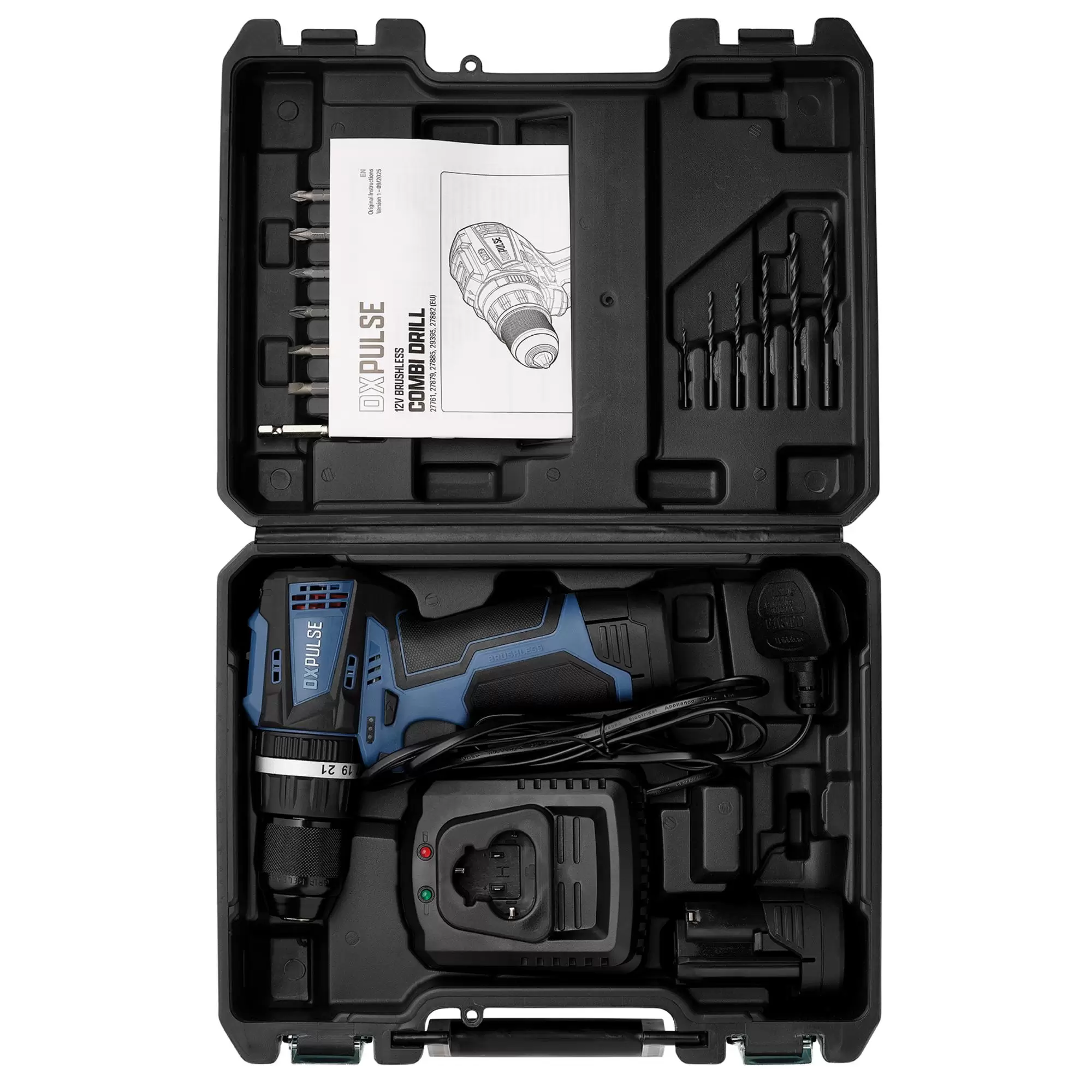 This cordless combi drill is part of the DXPULSE 12V Interchange Series and offers three functions: drilling, screwdriving, and hammer drilling. The brushless motor enhances efficiency, offering more power and a longer battery life. It features a 10mm metal keyless chuck, 21+3 torque settings, forward/reverse, a 2-speed gearbox, a variable speed trigger, and an LED worklight. Its compact design makes it ideal for use in tight spaces. Weighing less than 1 kg, it is easy to use, and the soft grip handle ensures comfort during extended use. It is powered by a 12V lithium-ion battery, and there is an LED battery level indicator. Comes complete with 2 x 2.0Ah batteries and 1 x charger, a range of screwdriver bits, bit holder and HSS drill bit in a sturdy plastic storage case.