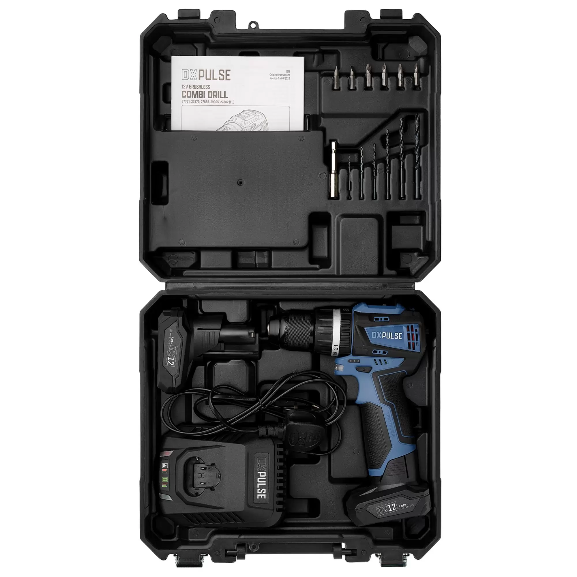 This cordless combi drill is part of the DXPULSE 12V Interchange Series and offers three functions: drilling, screwdriving, and hammer drilling. The brushless motor enhances efficiency, offering more power and a longer battery life. It features a 10mm metal keyless chuck, 21+3 torque settings, forward/reverse, a 2-speed gearbox, a variable speed trigger, and an LED worklight. Its compact design makes it ideal for use in tight spaces. Weighing less than 1 kg, it is easy to use, and the soft grip handle ensures comfort during extended use. It is powered by a 12V lithium-ion battery, and there is an LED battery level indicator. Comes complete with 2 x 4.0Ah batteries and 1 x fast charger, a range of screwdriver bits, bit holder and HSS drill bit in a sturdy plastic storage case