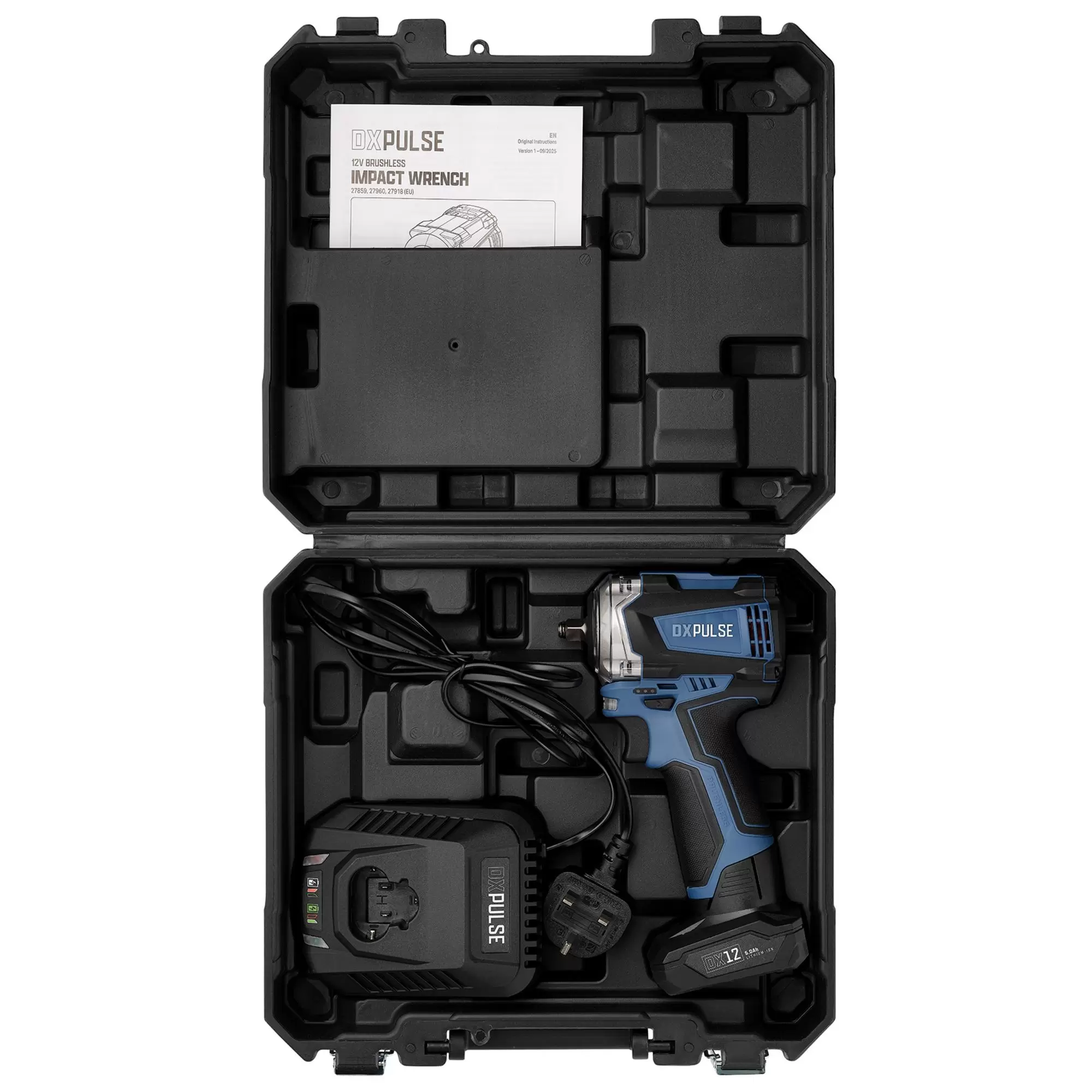 This cordless impact wrench is part of the DXPULSE 12V Interchange Series. The brushless motor enhances efficiency, offering more power and a longer battery life. It features a durable aluminium gearbox, 3-speed settings, a variable speed trigger with quick stop, forward/reverse and an LED worklight. Its compact design makes it ideal for use in tight spaces. Weighing less than 1 kg, it is perfect for overhead tasks, and the soft grip handle ensures comfort during extended use. It is powered by a 12V lithium-ion battery, and there is an LED battery level indicator. Comes complete with 1 x 5.0Ah battery and 1 x fast charger in a sturdy plastic storage case