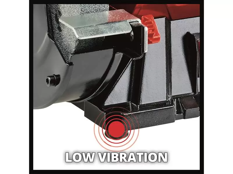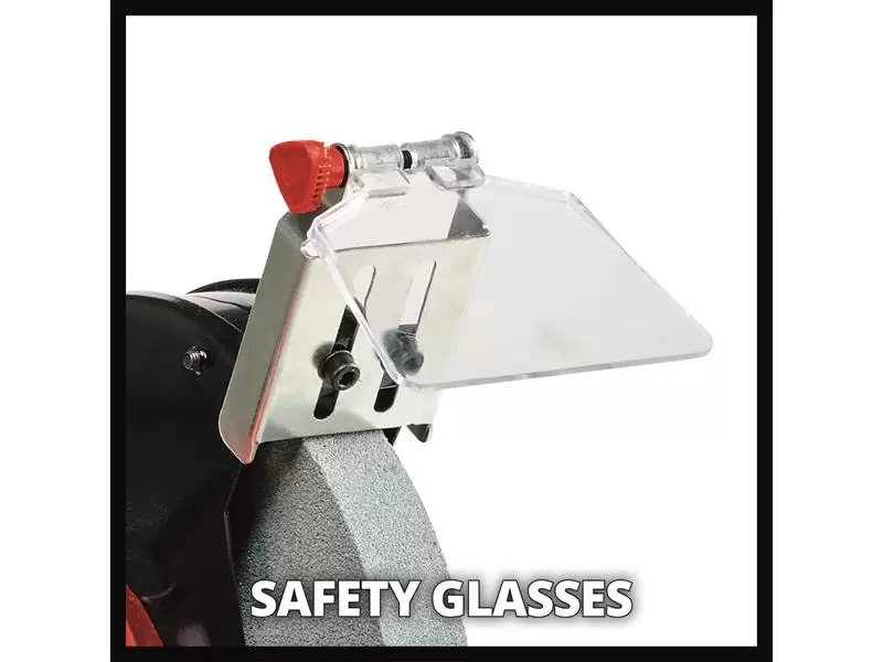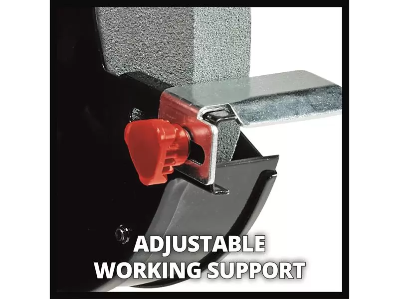 The robust compact metal construction ensures the grinder has a long service life. Large adjustable work supports are a help for a wide range of applications. A ball bearing mounted shaft with zero play makes it possible to achieve precise results. For safety there are spark guard windows which can be adjusted without any tools, plus guard hoods which are closed at the sides. Four rubber feet absorb vibrations and ensure a secure and steady standing position in operation.