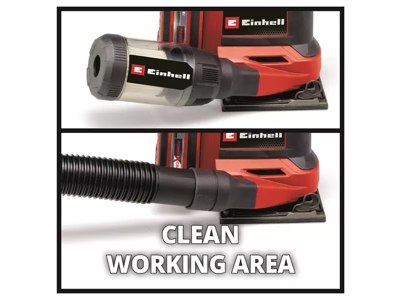 The sandpaper can be exchanged quickly with the help of hook-and-loop fastening and fixed without wrinkles. A clamping device is also integrated for attaching standard sandpaper. To keep the work area clean, the orbital sander has an integrated dust extraction system with dust collection box and removable pleated filter. Alternatively, an external suction system, for example an Einhell wet/dry vacuum cleaner, can also be attached to the extraction connection.