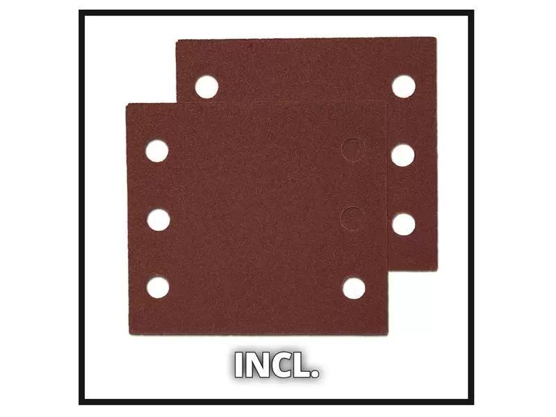Supplied with an already mounted sanding plate (101 x 113mm) and 2 x Sandpaper (P120).