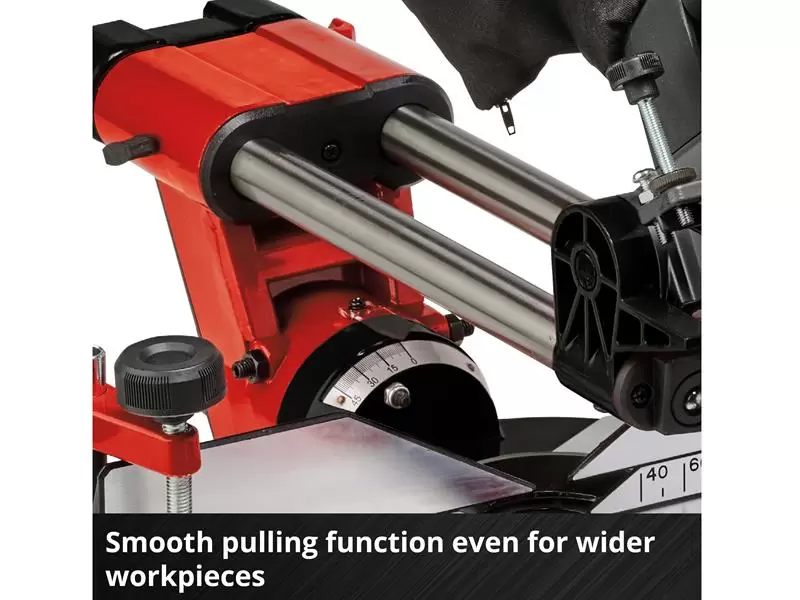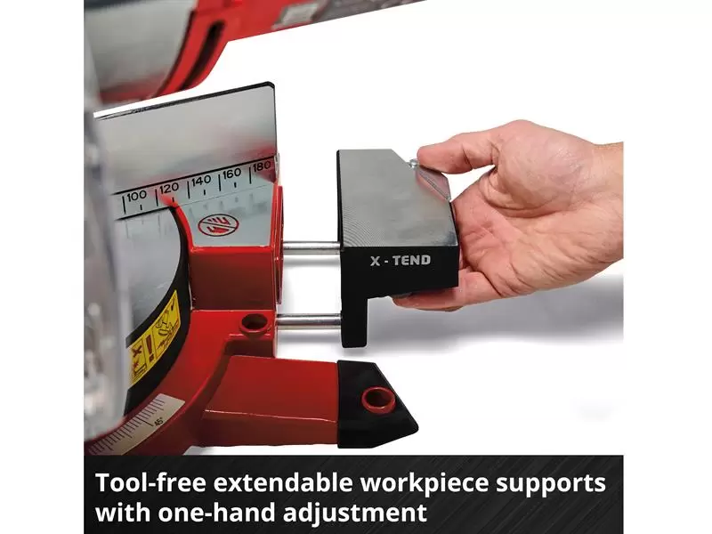 Equipped with a smooth draw function which is suitable for wider workpieces. The X-Tend workpiece supports can be adjusted with one hand and without the need for any tools. The clamping device is for holding the workpiece securely in position. The turntable has a precise angle adjustment facility for angular cuts. In addition, the saw head can be tilted up to 45° to the left for mitre cuts.