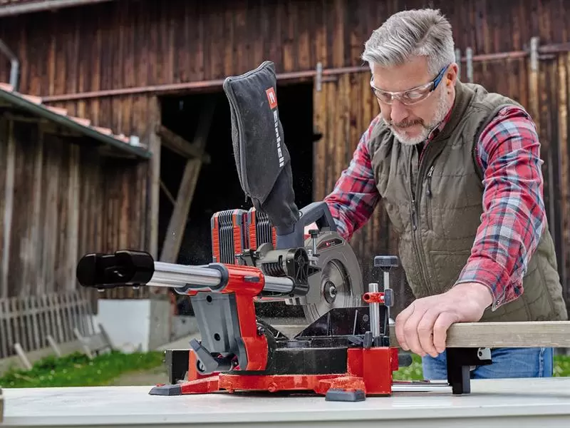 The Einhell TE-SM 36/210 Li-Solo Power X-Change Sliding Mitre Saw is suitable for all woodworking jobs; cutting mitre cuts and for cross-cutting and even cutting parquet to length.
