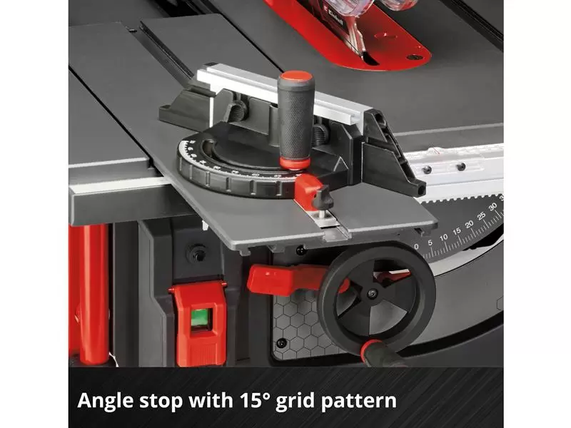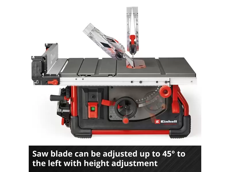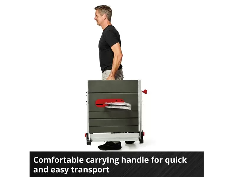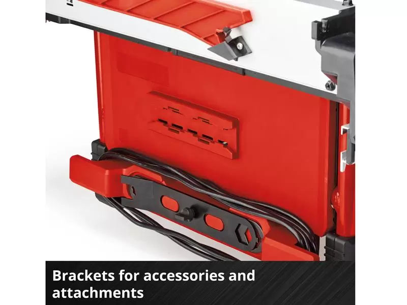 If the working area needs to be kept clean, any Einhell wet and dry vacuum cleaner can be connected to provide suction via the extraction adapter. The saw has a soft start function to protect both the motor and the fuses. The sturdy steel frame construction with rubberized feet ensures secure positioning of the table saw with low vibration, while multiple transport handles, a cable winder and brackets for all attachments and accessories facilitate transport.