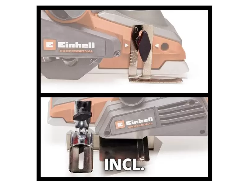 Both workpieces and the planer itself are protected by the automatic parking shoe. An ergonomic handle ensures a stable, secure grip and fatigue-free work. Thanks to the softgrip surface, the cordless planer is extremely comfortable to handle. In addition, a Ø 36mm suction adaptor can be connected, which works with any suitable Einhell wet/dry vacuum cleaner.