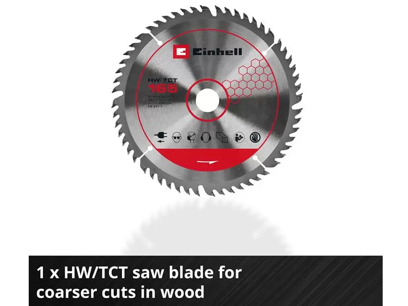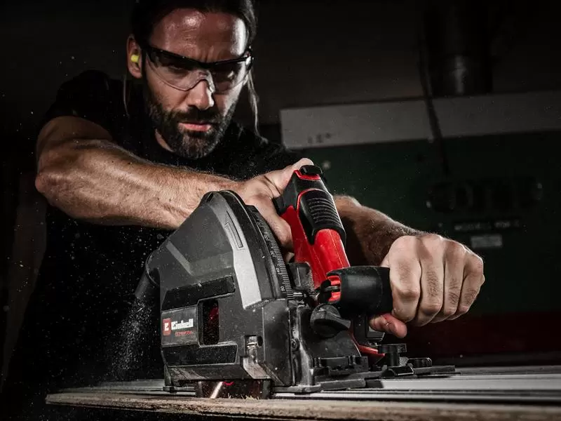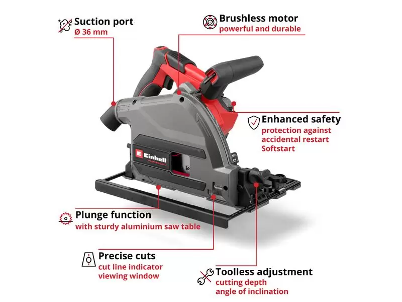 Equipped with an ergonomic main handle and front handle. The softgrip surfaces also ensure fatigue-free working. Cutting depth and tilt angle can be adjusted easily and without tools. The high-quality carbide-tipped saw blade (Ø 165mm) works powerfully through materials up to a cutting depth of up to 56mm at 90° (without guide rail). Clean cuts are also guaranteed in the area of use close to the edge. An integrated swiveling suction connection keeps your workspace clean at all times. In addition, the cordless plunge saw is compatible with the Einhell guide rail system.