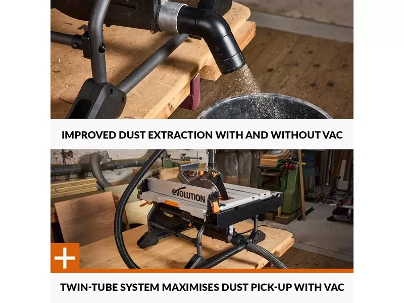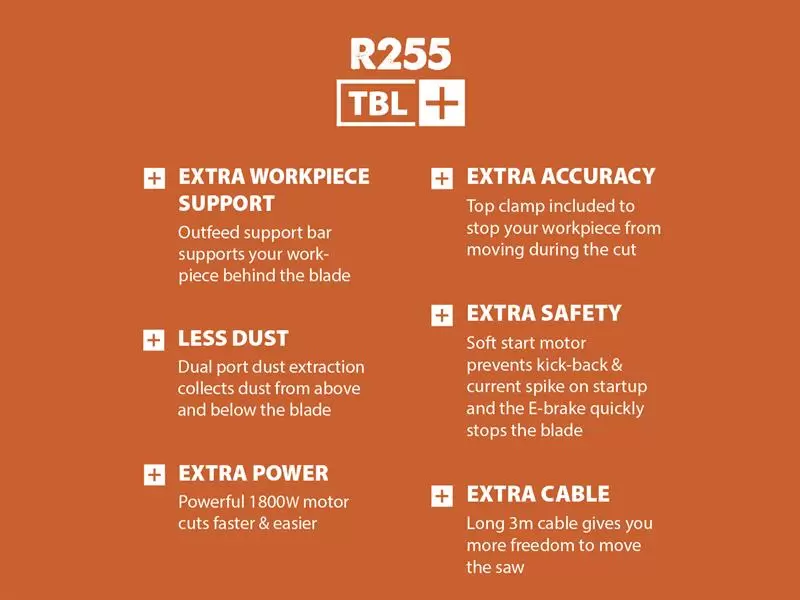 The powerful 1,800W motor features soft-start, electronic blade brake, motor overload protection and a paddle style emergency stop ensuring safe operation. Its blade guard offers improved cut visibility, and the quick release riving knife design features offset angle and lateral adjustment for easier and safer cutting, especially when handling full size boards. The new motor housing offers improved dust extraction , better access for cleaning, and blade swaps are easier than ever before.
