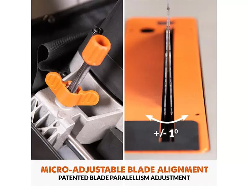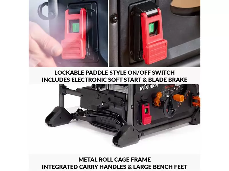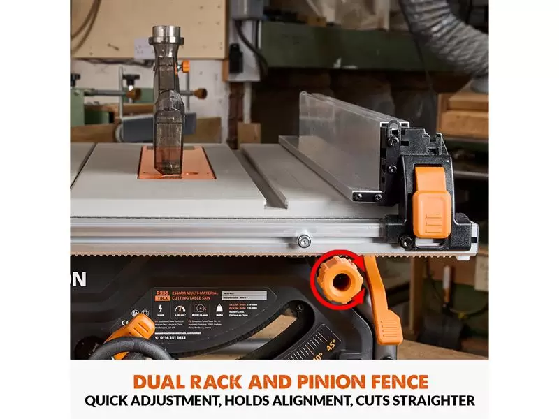 The Evolution R255TBL+ Portable Jobsite Table Saw is more accurate. It features a dual rack & pinion rip-fence for accurate, repeatable cuts. A new gear-driven blade height and bevel adjustment mechanism offers repeatable micro-adjustment. Our patented blade-to-rip-fence parallelism adjustment allows for perfectly aligned cuts in full-size sheets without binding or kickback. The R255TBL+ also features a metal throat plate with corner height adjustment.