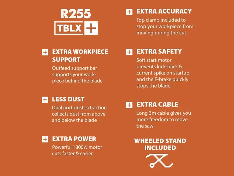 This R255TBL Table Saw is more portable. Mounted within a light, roll-cage chassis, with integral carry handles. It’s an easy one man carry without the wheeled stand. Superbly mobile thanks to the included folding stand, equipped with the tubular steel all-terrain wheeled support as standard. Fixed to the table with 4 bolts it gives you the flexibility to run your new table saw as a bench mount or stand mount unit and to swap between the two options in less than a minute. It easily passes straight through a standard width internal door (32in) making it the perfect jobsite saw.