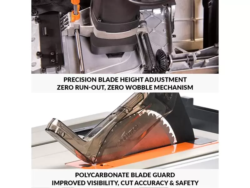The powerful 1,800W motor features soft-start, electronic blade brake, motor overload protection and a paddle style emergency stop. The blade guard offers improved cut visibility, and the quick release riving knife design features offset angle and lateral adjustment for easier and safer cutting, especially when handling full size boards. The new motor housing offers improved dust extraction , better access for cleaning, and blade swaps are easier than ever before.