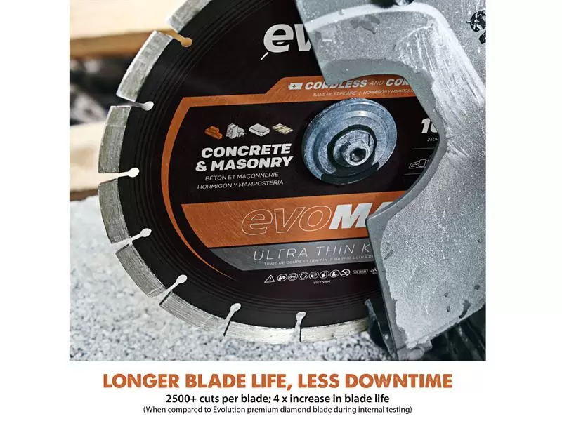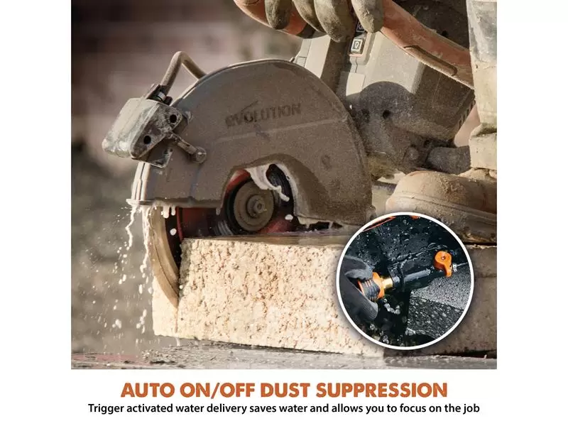 The Evolution R260DCT-Li Cordless Disc Cutter is designed for the trade. It features automatic, water-fed dust suppression. This lets the water flow as soon as the blade starts spinning and cuts the water off when you release the power. There's also an independent flow rate control valve, so you can 'set and forget' to get perfect cuts every time.