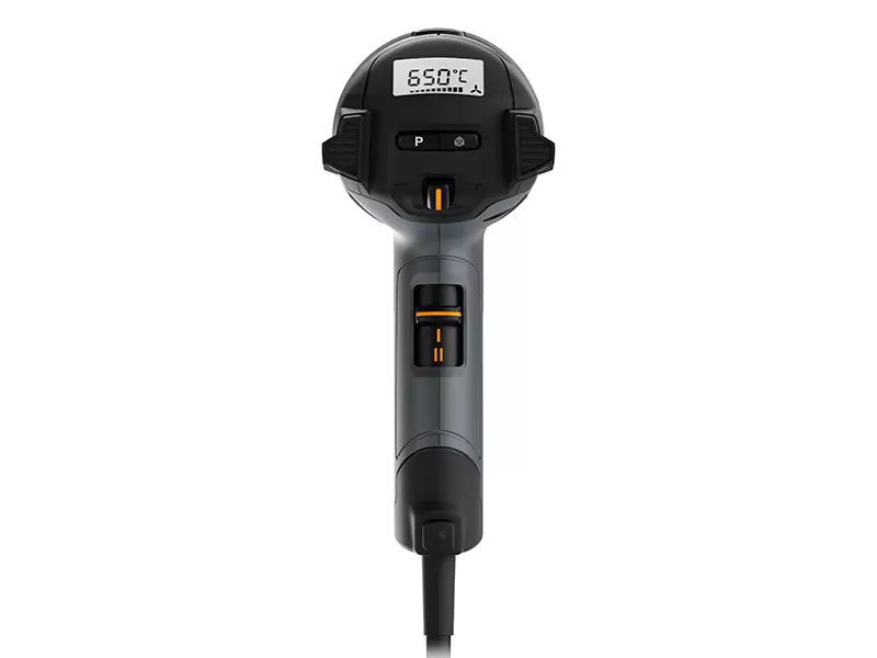 The Steinel HG2320E LCD Heat Gun offers a digital precision tool for temperature-critical materials. The ceramic heaters temperature can be infinitely varied over a range of 80-650°C at the thumbwheel. Integrated thermal cut-out eliminates the risk of overheating. Airflow can be controlled in 2 stages from 150–500 l/min.