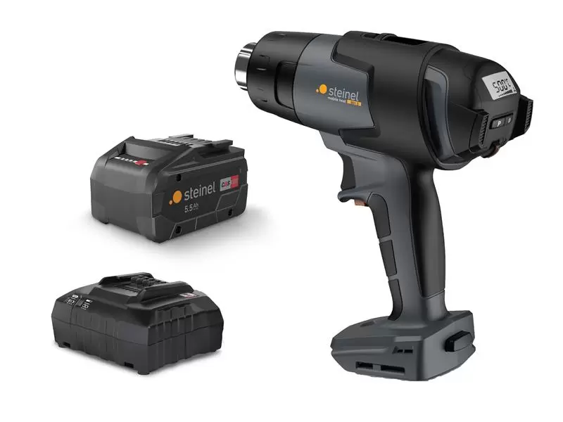 The Steinel MobileHeat 5 Professional Cordless Heat Gun can work productively immediately after starting, it reaches 300 °C in just 4 seconds. Flexible setting options: temperatures between 50°C and 500°C with 6 air flow levels (up to 300l/min) for every application. A lock button provides safe working. It also features an LCD display and LED lighting on the base of the device for better illumination.