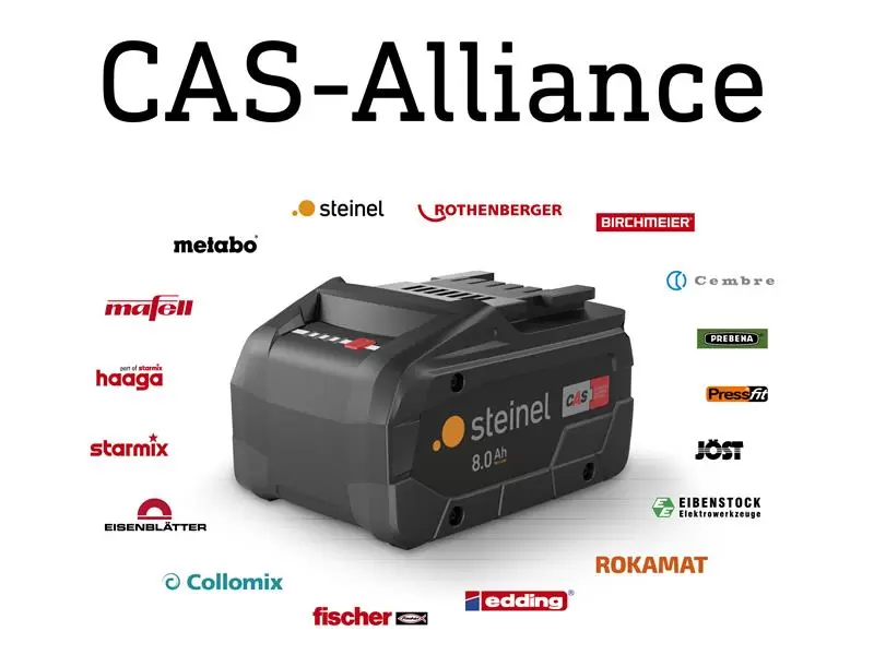 Works with all CAS (Cordless Alliance System) batteries: Metabo, Mafell, Rothenberger, Collomix, Eibenstock, Eisenblätter, Haaga, Starmix, Steinel, Rokamat, Birchmeier, Edding, Fischer, Prebena, Cembre, Pressfit, Jöst, Trumpf, Gespia, Montipower, Scangrip, Baier and ITH.
