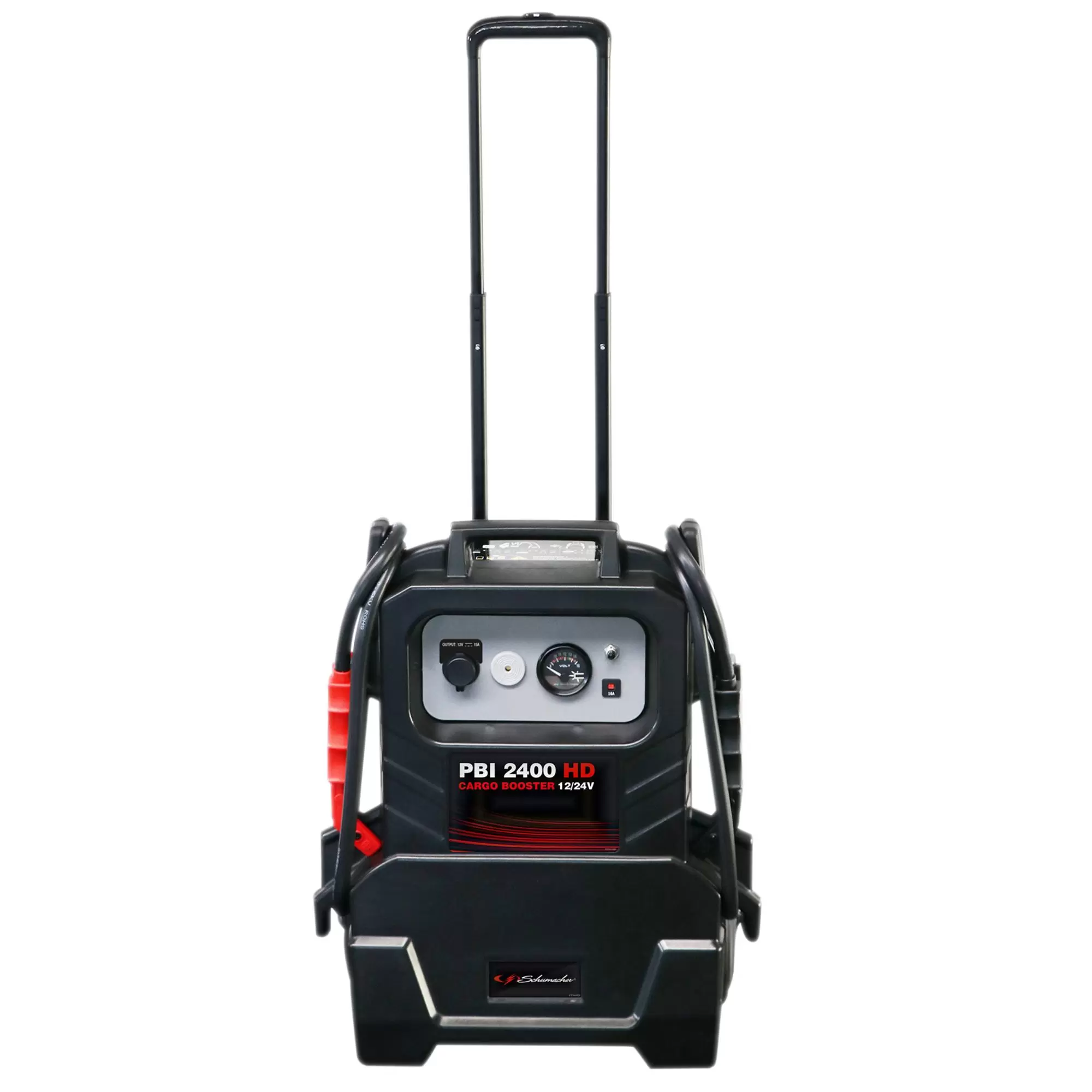 This professional jump starter from Schumacher is designed for use with 12V and 24V systems and can start diesel engines up to 1,500HP. It features two professional 1,200CA AGM batteries with high efficiency, providing up to 2,400CA in 12V mode. The jump starter comes with Anderson connectors that allow for easy voltage selection between 12V and 24V. The unit is housed in a robust rotomolded casing with a carry handle, retractable pull handle, and puncture-proof wheels for easy transportation. It also includes heavy-duty curved double-insulated clamps for secure battery terminal connection. Additionally, there is a 12V outlet that can be used for memory saver mode. The jump starter is equipped with a reverse polarity alarm and a 500A in-line fuse to prevent short circuits, and it comes with one spare fuse.
