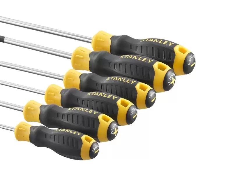 Each STANLEY® CUSHION GRIP™ Screwdriver is engineered from high-strength, chrome vanadium steel to reduce the chance of tip breakage. The strong magnetic black oxide tip is designed for improved screw retention, enhanced durability, reliability and extended product life. A chrome plated bar protects the screwdriver from rusting.
