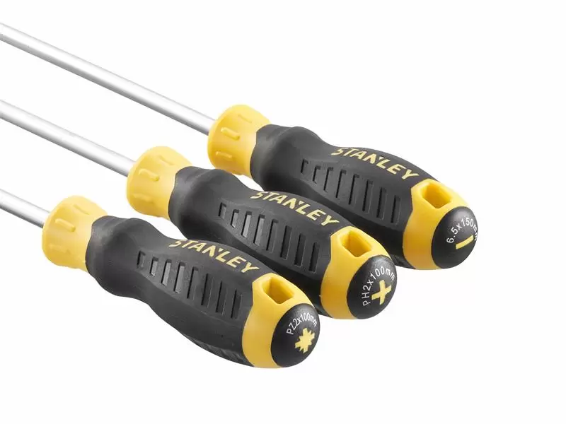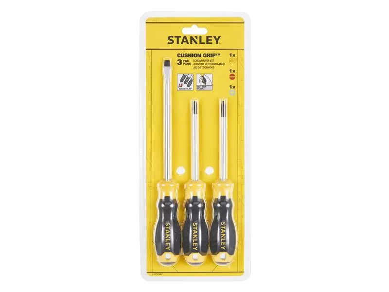 Each STANLEY® CUSHION GRIP™ Screwdriver is engineered from high-strength, chrome vanadium steel to reduce the chance of tip breakage. The strong magnetic black oxide tip is designed for improved screw retention, enhanced durability, reliability and extended product life. A chrome plated bar protects the screwdriver from rusting.